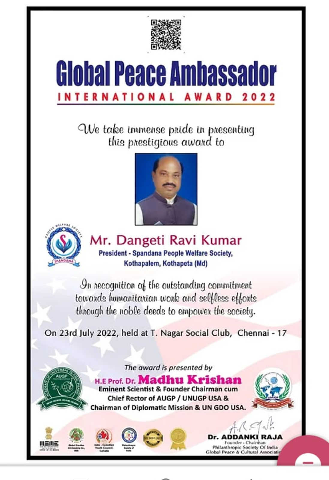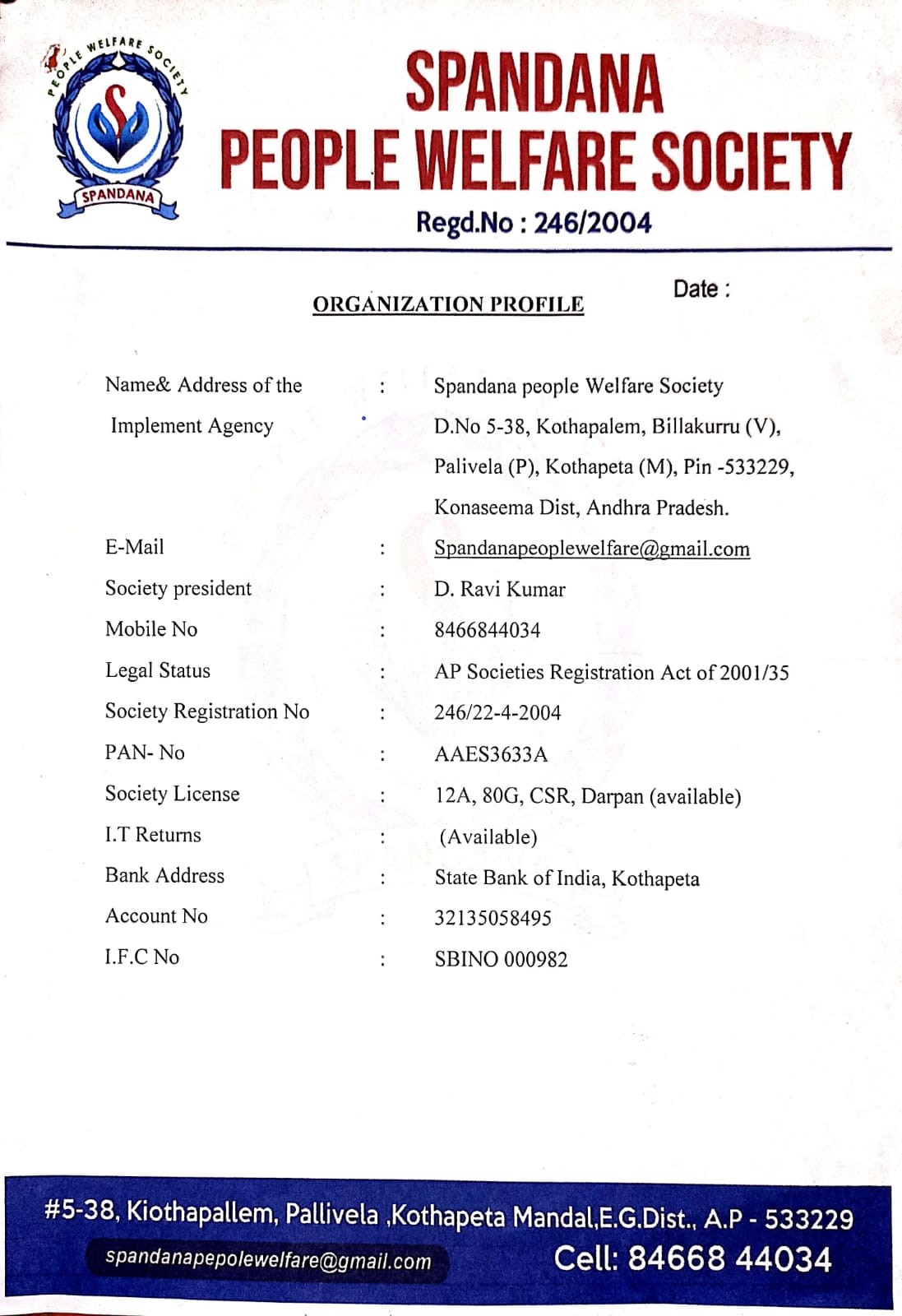 * Founder Of Spandana People Welfare Society *